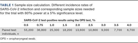 The study will be conducted during the second period of lockdown in Denmark with a positive rate of the RT-PCR test at the COVID-19 Test Centres in Copenhagen of 2.6% in the week before the study starts. Due to the lockdown, we estimate that the positive rate will decrease by approx. 40-50% weekly with an average of 1.5% during a three-week study period. Therefore, the sample size was determined to provide adequate power for assessment of the primary outcome estimating an incidence of SARS-CoV-2 infection at 1.5% of all the test results during the study period. Assuming that NPS would have a 25.6% higher sensitivity than OPS [7], we estimated that a sample of 18,200 participants would provide the trial with 80% power at a 5% significance level for a low correlation between the OPS and NPS test. This corresponds to including a total of 273 individuals with a positive OPS test. Anticipating that approx. 5% of the participants will be lost to follow-up or fail to complete all tests, at least 19,110 participants are required. However, if the positive rate changes in other ways than expected, this will change the sample size needed to provide adequate power for assessment of the primary outcome (Table 1). Test-positive rates will therefore be monitored during the study period to ensure that our sample size calculation assumptions remain correct. No data analyses will be conducted before data collection is completed.