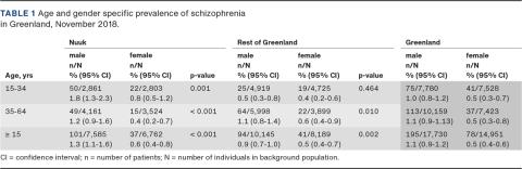 The 1.0% prevalence of schizophrenia in Nuuk among adults aged 15 years or above is comparable to and a bit higher than the prevalence observed internationally, 0.5-0.9% [4, 5]. The high male/female ratio (2.5) documented herein is rather high compared with the schizophrenia male/female ratios usually found in international studies. A systematic review including 1,721 prevalence estimates (154,140 prevalent cases) from 188 studies in 46 countries reported an average male/female ratio of 1.4 [4]. The mean age at diagnosis (25.0 years of age) was comparable to observations in a Danish study. According to a comprehensive nationwide follow-up study of all Danish residents (5.6 million persons, total follow-up 59.5 million person years), median age at diagnosis was 26.8 years for men and 29.1 years for women. The highest incidence for both genders was observed at the age of 22 years [10].