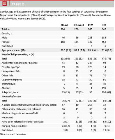 Results: A total of 2,016 falls were registered. Among these, 1,074 were accidental episodes of which 413 occurred in elderly patients with good balance. There were significant differences between the various screening locations. Need for fall prevention ranged from 50% to 84%. Elderly who were cognitively or physically impaired and elderly with abuse issues fell frequently and a need for fall preventive actions was observed in up to two of three falls in this subgroup of elderly.