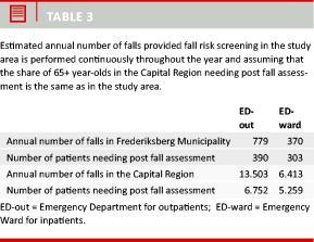 Assuming that screening is performed continuously in the ED, the number of annual post fall assessments is shown in Table 3. The estimated figures are based on the obtained study results regarding number of recorded falls and the proportion needing fall prevention.
