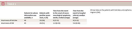 Results: Onset of neurological symptoms in LNB occurred year round in the Region of Southern Denmark. Only half of the patients had a history of a tick bite or erythema migrans (EM). Half of the patients who observed a tick bite subsequently reported EM. The duration from the onset of neurological symptoms to referral to hospital was remarkably long for patients with radiculoneuritis, whereas the onset of facial palsy led to a swift referral. Patients who were ≥ 50 years old had a significantly lower age-related risk of facial palsy without radicular symptoms.