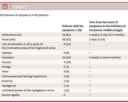Methods: The medical records of 69 patients with confirmed LNB who attended the Department of Neurology, Lillebaelt Hospital, Vejle, Denmark, were analysed. The diagnosis was confirmed by the presence of leucocytosis in the cerebrospinal fluid and intrathecal production of