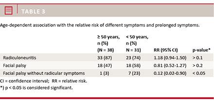 A significantly lower risk of facial palsy without radicular symptoms was seen in the older age group (Table 3).