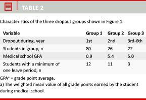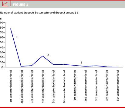 he dropout showed a distinct pattern of three dropout groups (Figure 1). A large group of 80 students dropped out early during the first year of medical school (Group 1). In this group, we included 12 students who were not registered in the administrative database for any credits, passed exams, grades, or re-sits, and, therefore, perhaps never turned up or left medical school very early during the first semester. The remaining 68 students were registered with credits, passed exams or re-sits, but left medical school during their first year. Another group counting 26 students dropped out later during the second year of medical school (Group 2). The last 22 students dropped out late during the third, fourth or fifth year of medical school (Group 3).