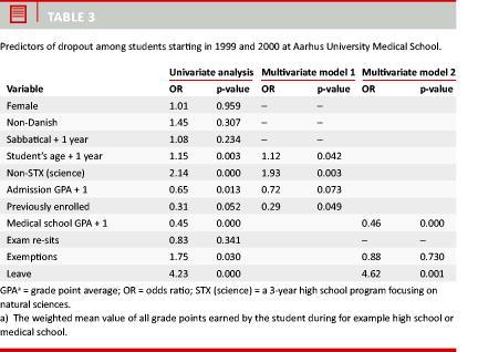 Material and methods: In this retrospective cohort study, relevant variables were extracted from the established database of Aarhus University for the 639 students initiating medicine studies between 1 January 1999 and 31 December 2000. A multivariate pre-admission and post-admission model was examined.
