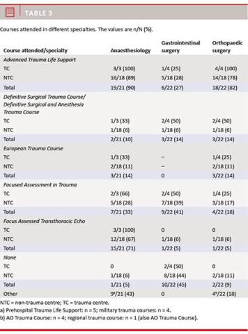 A total of 20% of doctors had not attended any trauma-related course. Of these, 77% were GI surgeons, 15% orthopaedic surgeons and 8% anaesthesiologists (Table 3).