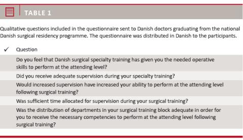 Results: A total of 30 graduated residents (55%) responded to the Danish survey. Among those, 14 (47%) felt ready to be a specialist in surgery. A total of 25 (83%) answered that increased supervision would have increased their self-perceived competencies to serve as a surgical specialist. Self-perceived readiness was significantly associated with level of supervision during surgical training (p = 0.02), whereas no association with operative volume could be established.