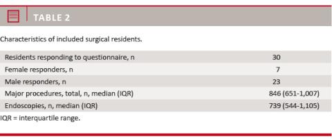 A total of 55 surgical residents received the questionnaire, and 30 residents (55%) responded. The median total number of major procedures achieved during surgical training was 846 (651-1,007) in addition to 739 (544-1,105) endoscopic procedures. There was an uneven gender distribution in the responsive residents with 77% men and 23% women;