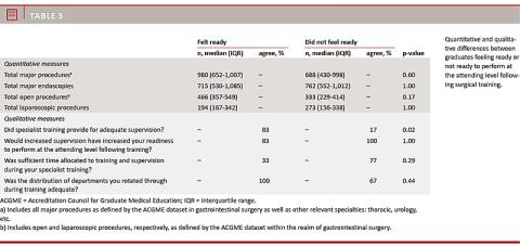 Conclusions: A worryingly high number of graduates did not feel ready to undertake their role as a gastrointestinal surgical specialist. Adequate supervision seems to play a crucial role in education.