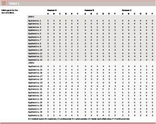 The ratings from two selection rounds in 2008 in which the final model was used were analysed in IBM SPSS Statistics ver. 19. Reliability analysis was performed by calculating Cronbach’s alpha, which is a measure of the internal consistency of a test score. Cronbach’s alpha is considered acceptable if the value is above 0.70. Cronbach’s alpha was calculated for each interviewer and for each selection round.