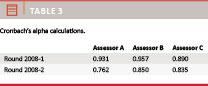 Marks given during the two rounds can be seen in Table 1 and Table 2. We found a high Cronbach’s alpha in the two sessions (Table 3). In the first interview session, we found an acceptable G coefficient of 0.736 using generalisability theory, but in the next session the G coefficient dropped to 0.401. In order to obtain a G coefficient of approximately 0.80, there would have had to be 8-9 questions in the first series and more than 15 questions in the last.