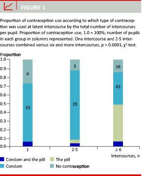 Young age at sexual debut was associated with knowledge of the legal minor’s right to an abortion (Table 1). Sexual debut was not associated with knowledge of reproduction biology and the legal limits of abortion. The experience in terms of number of intercourses clearly influenced the use of contraceptives (Figure 1). If the pupil used the pill, 95% (56 of 59) had had more than six intercourses. If the pupil had had more than six intercourses, 50% (56 of 115) used the pill. Paradoxically, two-thirds of those who did not use contraception gave pregnancy as the reason compared with 93% of contraception users (p < 0.002).