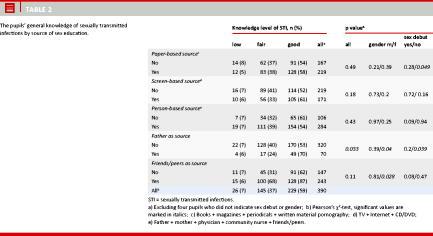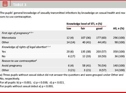 The main positive findings were that pupils with sexual debut knew the limits of legal abortion and were aware that chlamydia is the most common STI. The general knowledge of all pupils was good and adolescents’ knowledge on pregnancy was associated with STI. Moreover, their behaviour seemed adequate: The pill was used when the adolescent had sex frequently and intended to avoid pregnancy and condom users gave more consideration to STI.