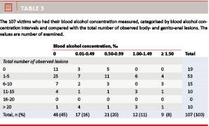 Table 3 and Table 4 show correlations between measured BAC and the total number of observed lesions, and between the measured BAC and the number of observed genito-anal lesions, respectively. About half of the victims in every BAC concentration group had up to five lesions. Even though there were few individuals in the category with more than 20 lesions, nine out of ten of these victims had alcohol in their blood (Table 3). Table 4 shows that half of those who had their BAC measured (50/107) had no genito-anal lesions and had a BAC below 1.0 per thousand. Relatively, morevictims who had genito-anal lesions (71%; 15/21) also had a BAC of more than 1.0 per thousand than (42%, 36/86) victims with genito-anal lesions who had a BAC below 1.0 per thousand (Table 4).
