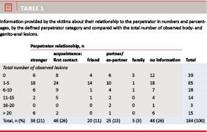 Perpetrator(s): Information about perpetrator(s) given by the victim was registered in 168 cases. Of these, 32 cases (19%) included unclear or no information about their relationship to the perpetrator, while 136 cases (81%) included specific information concerning their relationship. Half of all the victims (98/184) knew the perpetrator beforehand (Table 1). In eighteen cases (11%) (18/168), more than one perpetrator was reported.