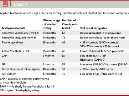 The participating families came to one of the two paediatric CI centres for testing accompanied by one or both parents. Four speech- and language pathologists, two from each centre, carried out the tests and the parental interviews. All testers used spoken language and all test results were scored according to standards from normally hearing children. Table 2 summarizes all tests and assessments used, the age criteria for each test, number of responses and standardised test categories for scoring.