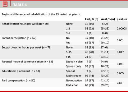 Results: The levels of audition were comparable between the group from West Denmark (West) and the group from East Denmark (East). In contrast, all tests of speech and language revealed a statistically significant difference between East and West. In all tests, West subjects scored significantly lower than East subjects. West children received more hours of speech therapy, more learning support assistance, and more parents used signing. Furthermore, the parents from West were significantly less involved in the auditory rehabilitation of their children than parents from East.