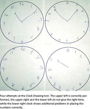 Screening of dementia is often done by applying a number of scales and it has been customary that both the MMSE and the CDT were part of this set-up. The CDT to some extent assesses the frontal and temporo-parietal brain function by roughly screening the following cognitive abilities: understanding of verbal material, apraxia, visuo-spatial ability, executive functioning, and abstract thinking. The CDT may in this way be seen as supplementing the MMSE and it does not seem to emotionally affect the tested individuals [18]. The CDT seems to correlate with other cognitive tests and with the regional cerebral blood-flow in Alzheimer disease patients [19].