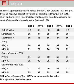 Results: Correlations between the CDTs and the other scales were good. The predictive values were almost identical (positive values: 93-97%; negative values: 70-74%). Three-word recall improved the values. Rates of dementia in general practice and corresponding predictive values were estimated which resulted in markedly lower positive values around 60% for a rate of dementia of 20%, and 40% for a rate of dementia of 10%.