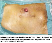 The most commonly used ports were SILS (Covidien), Triport (Advanced Surgical Concepts), Glove-Port-Single Port, Nelis Ltd. and GelPOINT (Applied Medical Corp) with access though the umbilicus or through a planned stoma site.