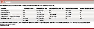 A total of 89 cases of rectal SPLS for malignant disease were reported. Four studies specified the number of harvested lymph nodes (LNH) (median number 13-18). All four studies reported one or more cases with less than 12 LNH. Only one study specified whether the patients had received preoperative neoadjuvant CRT [14]. One study included only patients who had rejected preoperative neoadjuvant chemotherapy, not mentioning radiotherapy [18]. AJCC stage was reported in three studies. Bulut et al [14] included 13 (52%) stage I+II cases and 12 (48%) stage III+IV cases. Chew et al [16] reported two (20%) stage I cases, five (50%) stage II cases and three (30%) stage III cases. Sirikurnpiboon & Jivapaisarnpong [18] reported two (20%) stage II and eight (80%) stage III cases. In three studies that gave information on radicality, all resections were R0 [14, 17, 18] (Table 2). Tumour size, resection margins (CRM) and completeness of the mesorectal fascia were reported in the study by Bulut et al [14]. Median tumour size was 32 mm (range 0-82 mm), and median CRM was 10 mm (range 1-25 mm). The mesorectal fascia was deemed complete or nearly complete in 92% of the patients. Sirikurnpiboon & Jivapaisarnpong [18] reported a CRM of at least 2 mm in all cases (median CRM not specified). The mesorectal excision was deemed complete or nearly complete in all patients.