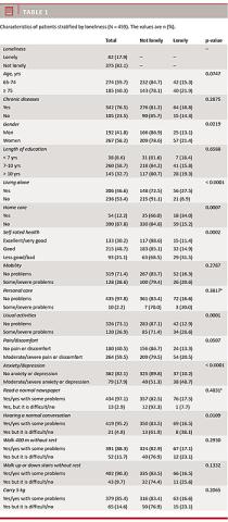 Table 1 presents the distribution of the variables in total and divided according to loneliness.