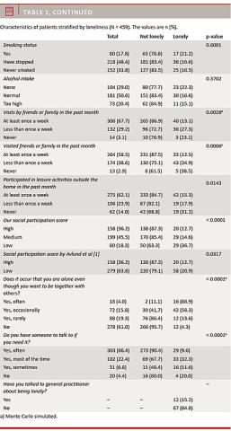 Results: Of 767 eligible patients, 474 were included and 461 answered one or more items about social participation or loneliness. A total of 36.2% had a high, 45.5% had a medium and 18.3% had a low social participation; and 17.9% often or occasionally felt lonely. Higher social participation was associated with a lower degree of loneliness. However, several patients answered in a manner not fitting the expected association. Anxiety and depressive symptoms, living alone and low social participation were the most important predictive variables for loneliness. Only 15.2% of the lonely patients had talked to their GP about their loneliness.