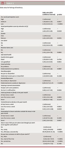 Several items were associated with loneliness (p < 0.05) (Table 1). As seen in Table 2, the odds of feeling lonely were 3.5 times higher for those living alone and four times higher for those with the lowest social participation compared with those with the highest social participation in our scale.