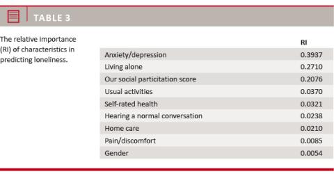Based on relative importance, the three most predictive variables for feelings of loneliness were whether patients were anxious or depressed (39%), were living alone (27%) and their level of social participation (21%), whereas the remaining variables each explained 0.5-4% of the variance (Table 3).