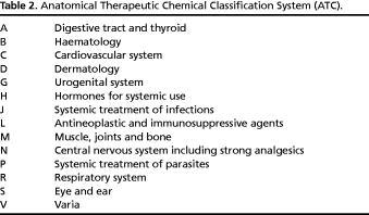 The prescription medications were classified according to the ATC classification system [17] ( Table 2 ). We report data on the most frequently used ATC groups: digestive tract and thyroid (A), cardiovascular system (C), systemic treatment of infections (J), muscle, joints and bone (M), central nervous system including strong analgesics (N), and respiratory system (R).