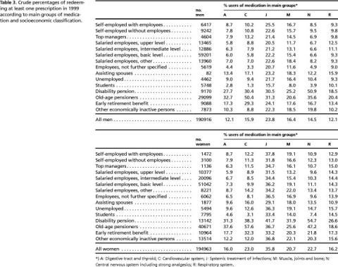 Results: The highest prevalence of medication use was by persons in early retirement, old age pensioners, people on disability pension and others outside the workforce. We found only minor differences among different economically active groups with slightly more male top managers using cardiovascular drugs. People in the upper half of the socioeconomic scale were somewhat less likely to redeem prescriptions for treating muscle, joints and bone, and central nervous system.