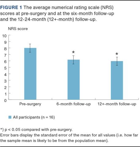 We found that eight patients, corresponding to half of the patients included in this study, had a clinically significant reduction of pain with a reduction of NRS score of three or more [14]. Six patients (37.5%) had a reduction of 1-2 NRS points. Two of the 16 patients (12.5%) had no effect or a poorer NRS score outcome than before their surgery.