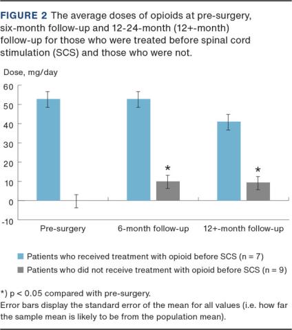 When studying the group of nine patients not taking opioids before SCS, we found that four patients had started treatment with opioid at the six-month follow-up. This equalled an increase in average daily intake from 0 mg to 10 mg (± SD: 13.33 mg) at the six-month follow-up (p = 0.03) and 9.4 mg (± SD: 13.83 mg) at the 12+-month follow-up (p = 0.04).