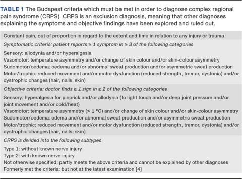 Complex regional pain syndrome (CRPS) is a devastating condition characterised by pain exceeding considerably what would normally be expected after a lesion or trauma. The pain is regional and is unrelated to a specific nerve innovation area or dermatome [1-3]. CRPS is grouped into CRPS type 1 (CRPS-1) – Without evidence of nerve damage, and CRPS type 2 (CRPS-2) – With evidence of nerve damage [2, 3]. To obtain a CRPS diagnosis, patients must meet the Budapest criteria (Table 1).