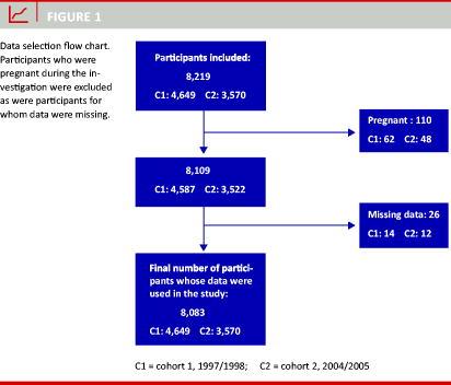 Of the 8,219 participants in the two cohorts, 8,083 were eligible for these analyses, Figure 1.