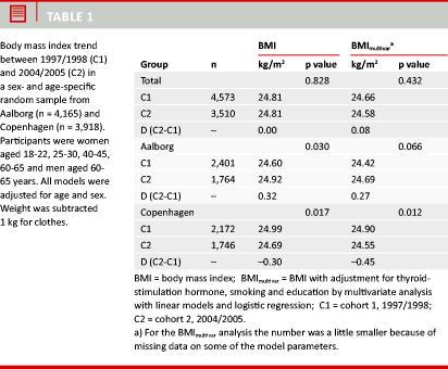 Our results showed an unchanged average BMI from 1997/1998 to 2004/2005 in the total cohort reflecting a possible stagnation in the BMI trend in Denmark. However, there was a marked difference in the change of BMI when we compared the two Danish regions of Aalborg and Copenhagen. We observed a significant increase in average BMI in Aalborg in the period, while a decrease in average BMI was observed in Copenhagen. According to the absolute BMI values, people were not in general more overweight in Aalborg than in Copenhagen, they were simply less overweight in 1997/1998 and have subsequently reached about the same level of BMI as seen in Copenhagen in 1997/1998.