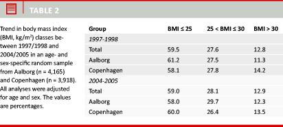 Material and methods: Data were drawn from two cross-sectional population-based studies conducted in parallel in Aalborg and Copenhagen from 1997/1998 and 2004/2005. Height and weight were measured in a total of 7,487 participants in the two cohorts.