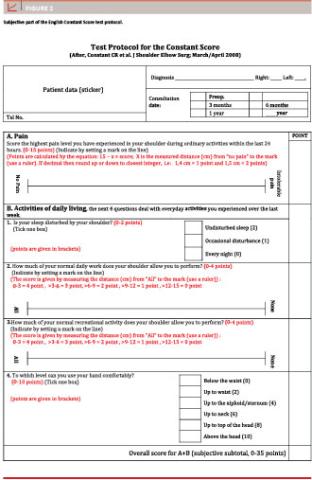 The CS, which was originally developed as a scoring system for the evaluation of functional outcome in patients with general shoulder disorders, is widely used internationally and recommended by the ESSSE, but at the same time often criticised for relying on imprecise terminology and for lack of a standardised, internationally accepted test protocol.