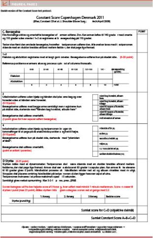 As treatment modalities for shoulder diseases evolve and new treatments are introduced, the need for assessment of functional outcome is increasing. The Constant Score (CS) [1] was among the first shoulder score systems developed and is considered the most commonly used scoring system for evaluation of various disorders of the shoulder [2]. The CS assesses subjective and objective shoulder function with respect to: A: pain; B: activities of daily living; C: range of motion and D: strength (Figure 1). The CS is often used to evaluate treatment progress and to compare results of clinical trials for several specific shoulder disorders [2-4]. The European Society for Surgery of the Shoulder and Elbow (ESSSE) and the Journal of Shoulder and Elbow Surgery recommend the CS for use in research on shoulder disorders [2, 5]. Nevertheless, it has been criticised for relying on imprecise terminology and for diffuse definitions of methodlogy in the original description of the score [2, 6, 7]. Thus, a standardised test protocol is not available. This has left room for different interpretations and use of the score between centres [7]. To address these weaknesses, Constant et al published a guideline paper in 2008 with recommendations for modifications of the original CS [2]. However, no standardised test protocol was included in these new recommendations and the validity and usefulness of the score therefore remains questionable. The need for a standardised test protocol was further emphasised in a 2010 systematic review of the psychometric properties of the CS [8]. Moreover, the CS revised in accordance with the newly modified guideline has not been translated and adapted into Danish.