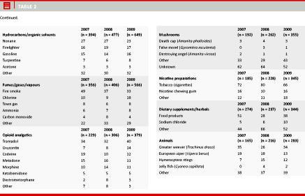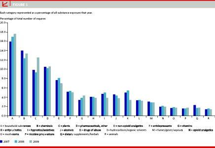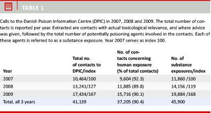 Table 1 shows the actual number of enquiries to the DPIC in 2007-2009. Ten percent of the enquiries were not related to acute poisoning but to theoretical questions, misdials, etc. The number of enquiries to the DPIC rose by approximately 70% from 2006 to 2009. Some enquiries (a tenth of the cases) involved more than one substance; therefore, the total number of substance exposures exceeded the number of contacts.