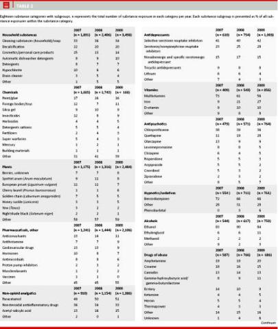 We analyzed data from all contacts to the DPIC in 2007, 2008 and 2009 and relevant substance exposures were divided into 18 substance categories, each with 3-11 subgroups, resulting in 113 subgroups in total.