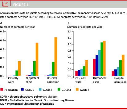 As expected, the use of hospital services among individuals with COPD, especially among those with severe disease, is very high and increases with the severity of COPD (Figure 1). Our estimates based on the present population sample are, in fact, in keeping with the actual figures that have been reported in the Danish NIP-COPD [5]. The NIP project, which is based on compulsory reports to The Danish National Patient Registry by all Danish hospitals, shows that in the Capital Region of Denmark in the year 2010, the hospitals had been in contact with approx. 1,100 subjects with very severe COPD (GOLD 4). In fact, this estimate is quite close to our estimate of 1,119 individuals with very severe COPD in the region (Table 2).