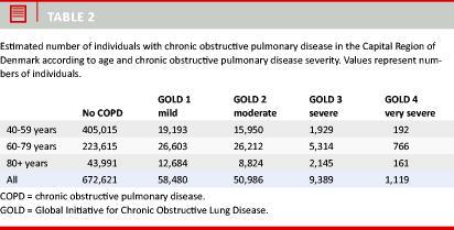 The distribution of COPD in our study sample according to age and severity of COPD is shown in Table 1. Based on this distribution, we estimated the number of individuals with COPD in the Capital Region of Denmark (Table 2). The results show that more than 60,000 citizens are expected to have clinically significant COPD (GOLD stage 2-4) and more than 10,000 have severe or very severe COPD (GOLD stage 3+4).