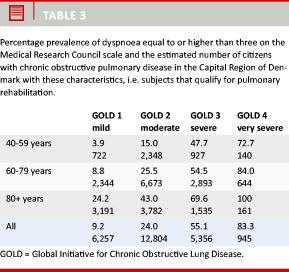 In conclusion, we report that more than 60,000 out of the 1.6 million inhabitants of the Capital Region of Denmark have spirometrically defined and clinically relevant COPD, corresponding to approx. 8% of the population older than 40 years of age. Although there may be a discrepancy between the presence of spirometrically defined COPD and the individual perception of a treatment need, our results indicate a substantial need for resources in order to implement the goals regarding early detection of COPD, smoking cessation, pulmonary rehabilitation and correct medical treatment.