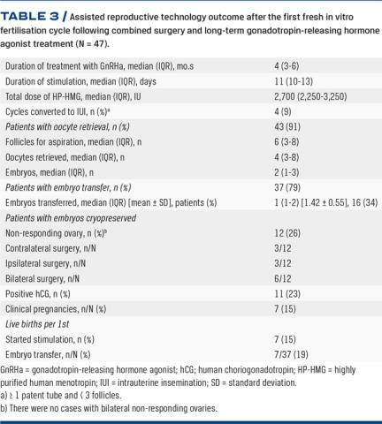 Study endpoints were characteristics and outcome of the first fresh IVF cycle immediately following combined surgery and long-term GnRHa: number of pre-ovulatory follicles, oocytes retrieved, embryos transferred, presence of non-responding ovary during high-dose gonadotropin stimulation, positive hCG, CPR and LBR. Clinical pregnancy was defined as ultrasonographically confirmed gestational sac(s) at six to seven weeks of gestation. Furthermore, cumulative LBR including pregnancies after ART as well as natural conceptions at follow-up were assessed.