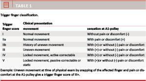 TF is defined as a finger that displays snapping or uneven movement during flexion and extension. The triggering may be anamnestic or assessed by a physician at a clinical exam. The patient may also complain of tenderness at the level of the A1-pulley in the palm of the hand in the affected digit. No validated disease-specific Danish scoring system exists for TF. We chose to grade the TF according to a Danish, novel and non-validated trigger finger score (TFS) adapted from Quinnell [2] (Table 1).