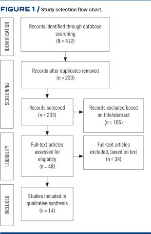 The systematic literature search produced 412 publications (n = 233 after removal of duplicates). The study selection process is shown in Figure 1. A total of 48 publications were analysed as full text; 14 of these studies were included in the quantitative synthesis. Study characteristics are summarised in Table 1.