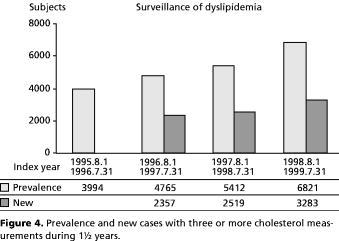 The prevalence of subjects monitored for dyslipidaemia, evaluated as number of subjects with three or more measurements during 11/2 years, increased by 71% from the first to the forth year ( Figure 4 ) (For this estimation plasma cholesterol measurements from 2000.8.1. to 2001.1.31. were added to the database). For the monitored subjects identified by this algorithm, the median number of measurements during 11/2 years was four measurements (75 and 90 percentile, five and seven measurements).
