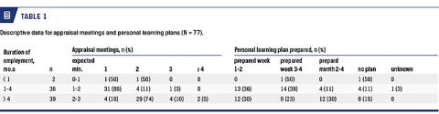 As shown in Table 1, all respondents had a minimum of one appraisal meeting, and 90% (35/39) of PGY1 doctors who had been employed for more than four months had a minimum of two appraisal meetings. A total of 86% (65/76) had a personal learning plan. Of these, 33% (25/76) had the plan prepared within the first two weeks of employment as required, and 64% (49/76) had a plan prepared within their first month of employment.