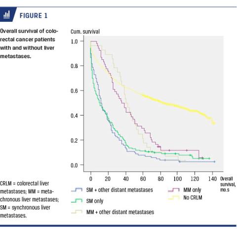 Of the total population of 1,672 patients, 801 patients were eligible for five-year survival analyses. For patients with SM the five-year survival rate was 6.6%, and for patients with MM it was 32.4% compared with 56.9% for patients without CRLM.